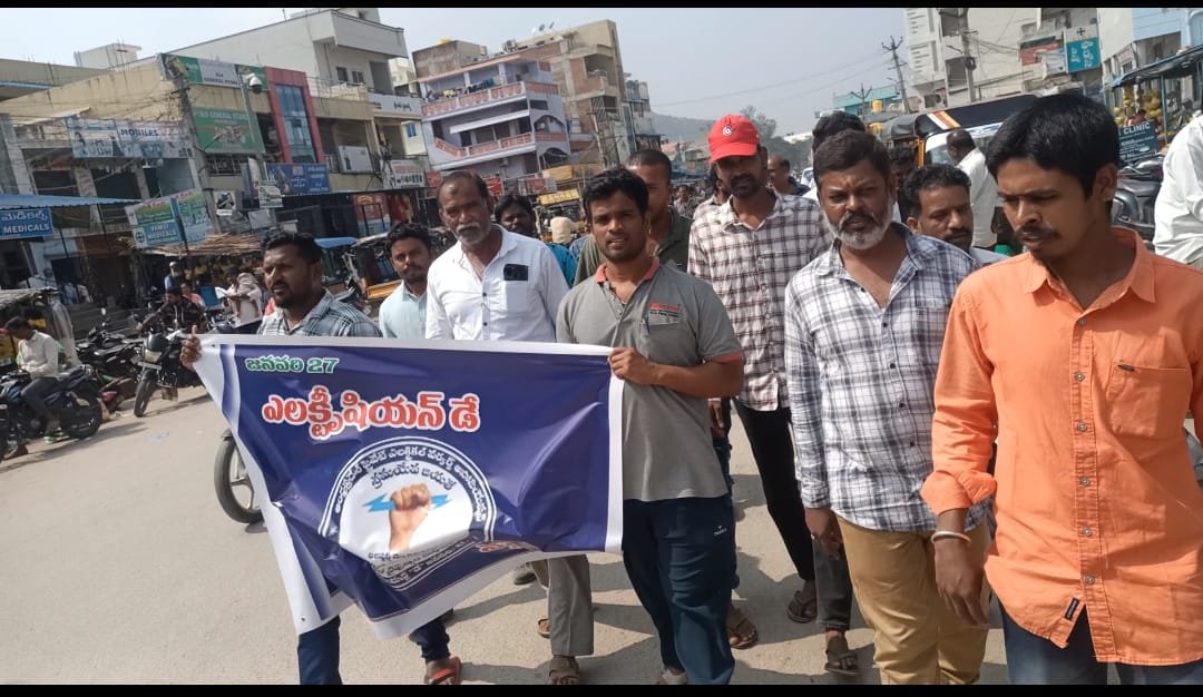 చిత్తూరు జిల్లా/ బంగారుపాలెం జనవరి 27.చిత్తూరు జిల్లా పూతలపట్టు నియోజకవర్గం బంగారుపాళ్యం మండల కేంద్రంలో మంగళవారం జాతీయ ఎలెక్ట్రిషియన్ దినోత్సవాన్ని ఎలెక్ట్రిషియన్ యూనియన్ సభ్యులు ఘనంగా నిర్వహించారు.ముందుగా ప్రభుత్వ కాలేజి వద్ద ఉన్న అంబేద్కర్ విగ్రహానికి పూలమాలలు వేసి నివాళులర్పించారు. అక్కడి నుండి ప్రభుత్వ ఆసుపత్రి వరకు ర్యాలీ నిర్వహించి మంగళవారం మధ్యాహ్నం 12 గంటలకు సుమారు వందమందికి పైగా అన్నదాన కార్యక్రమం నిర్వహించారు. కార్యక్రమంలో ప్రభుత్వ వైద్య శాఖ అధికారి డాక్టర్ శిరీష, హెడ్ నర్స్ సుమతి బాయ్ పాల్గొన్నారు. ఈ సందర్భంగా ప్లంబర్ & ఎలక్ట్రిషన్ వారు మాట్లాడుతూ, థామస్ అల్వా ఎడిషన్ బల్బ్ కనిపెట్టిన రోజును మేము ఎలెక్ట్రిషియన్ దినోత్సవంగా జరుపుకుంటున్నామని, రాష్ట్రవ్యాప్తంగా నాలుగువేల మంది ఎలక్ట్రిషన్లు ఉన్నామని మా ఎలెక్ట్రిషియన్ ల సమస్యలపై ప్రభుత్వానికి విన్నవిస్తామని తెలిపారు.అలాగే ప్రజలకు ఇబ్బందులు లేకుండా సర్వీసు చేస్తున్నామని తెలిపారు.ఈ కార్యక్రమంలో బంగారుపాలెం మండల యూనియన్ సభ్యులు పాల్గొన్నారు. గతం నుండి 100 సంవత్సరాలకు పైగా ఈ కార్యక్రమాన్ని నిర్వహిస్తున్నట్లు ఎలక్ట్రిషియన్ సభ్యులు తెలియజేశారు. తమకు మండలంలో ఒక భవనానికి స్థలం కేటాయించాలని గతంలో ఐటీ, విద్యాశాఖ మంత్రి నారా లోకేష్ ను కలిసినట్లు తెలియజేశారు. ఈ విషయాలపై తమకు న్యాయం చేయాలని వారు మీడియా ముందు విన్నవించారు. ఈ కార్యక్రమంలో రాష్ట్ర ఎగ్జిక్యూటివ్ నెంబర్ వి శ్రీనివాసులు, గౌరవ అధ్యక్షులు అన్సర్ భాష, అధ్యక్షులు జె మొగిలీశ్వర్ రెడ్డి, ఉపాధ్యక్షులు హేమశేఖర రెడ్డి, కార్యదర్శి గణపతి, ఉప కార్యదర్శి బాలకృష్ణ, కోశాధికారి వంశీ, కమిటీ మెంబర్లు మహేష్ తదితరులు పాల్గొన్నారు.