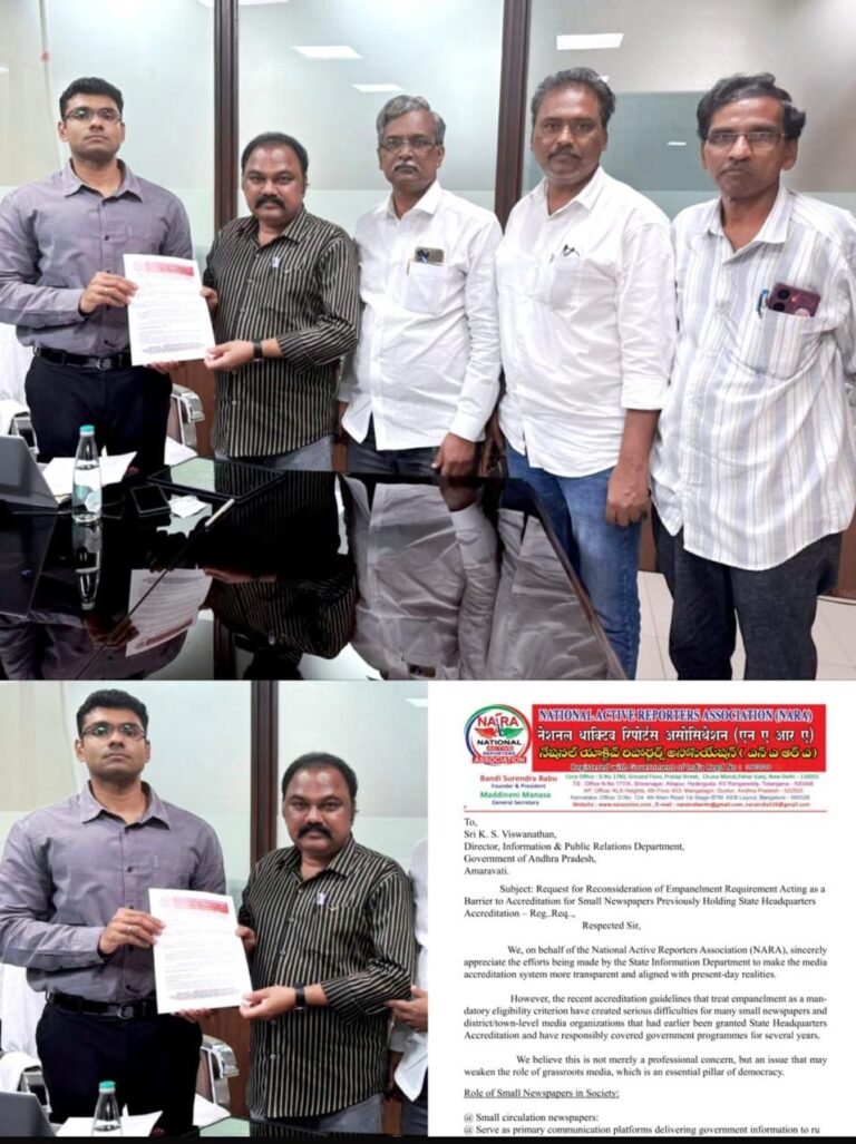 రాష్ట్రవ్యాప్తంగా చిన్న సర్కులేషన్ పత్రికలు ఎదుర్కొంటున్న అక్రిడిటేషన్ సమస్యల పరిష్కారంపై ప్రభుత్వం సానుకూల దృక్పథంతో చర్యలు తీసుకుంటుందని సమాచార & ప్రజా సంబంధాల శాఖ డైరెక్టర్ ఎస్. విశ్వనాథన్ తెలిపారు. విజయవాడలో జరిగిన సమావేశంలో నేషనల్ యాక్టివ్ రిపోర్టర్స్ అసోసియేషన్ (NARA) ప్రతినిధులు సమగ్ర వినతిపత్రం సమర్పించి చిన్న పత్రికల సమస్యలను వివరించారు.